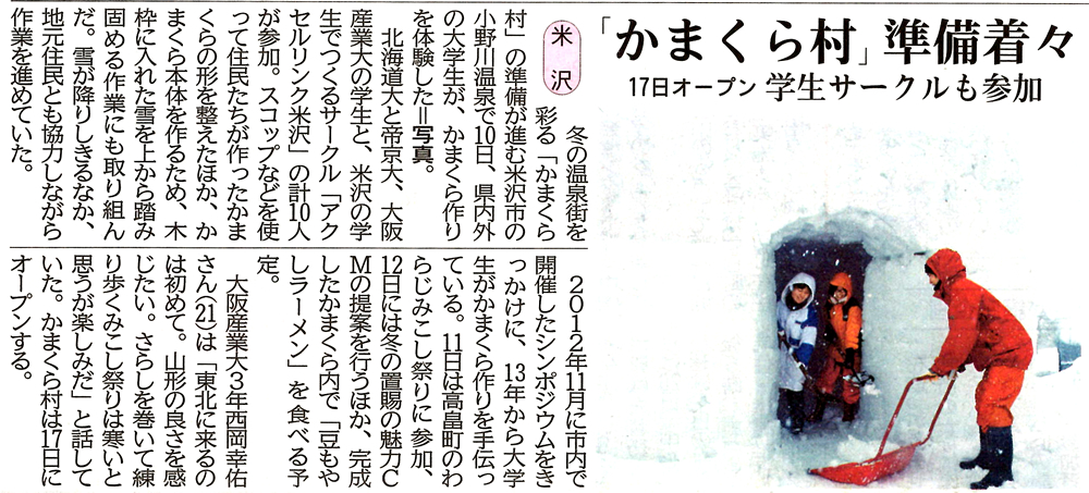小野川温泉のかまくら村、学生たちが新聞に載った