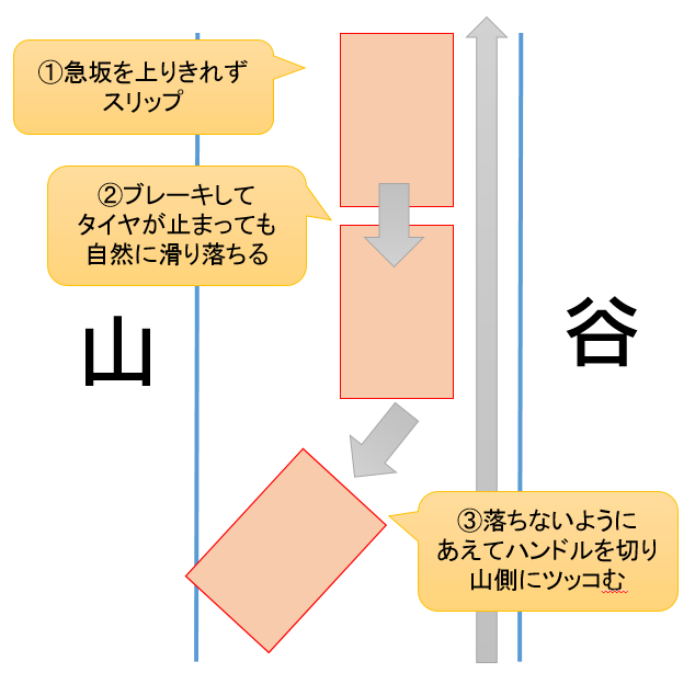 車はタイヤが止まっているのにも関わらず、ズルズルと下っていきます。