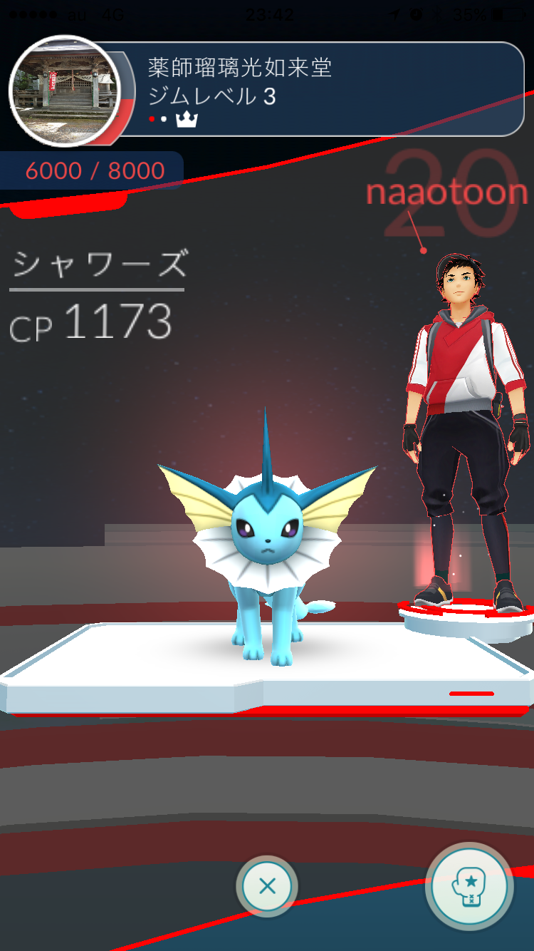 上の画面では、赤チームの「naaotoon」というレベル20のプレイヤーが、シャワーズというCP(強さ)1173のポケモンを置いています。