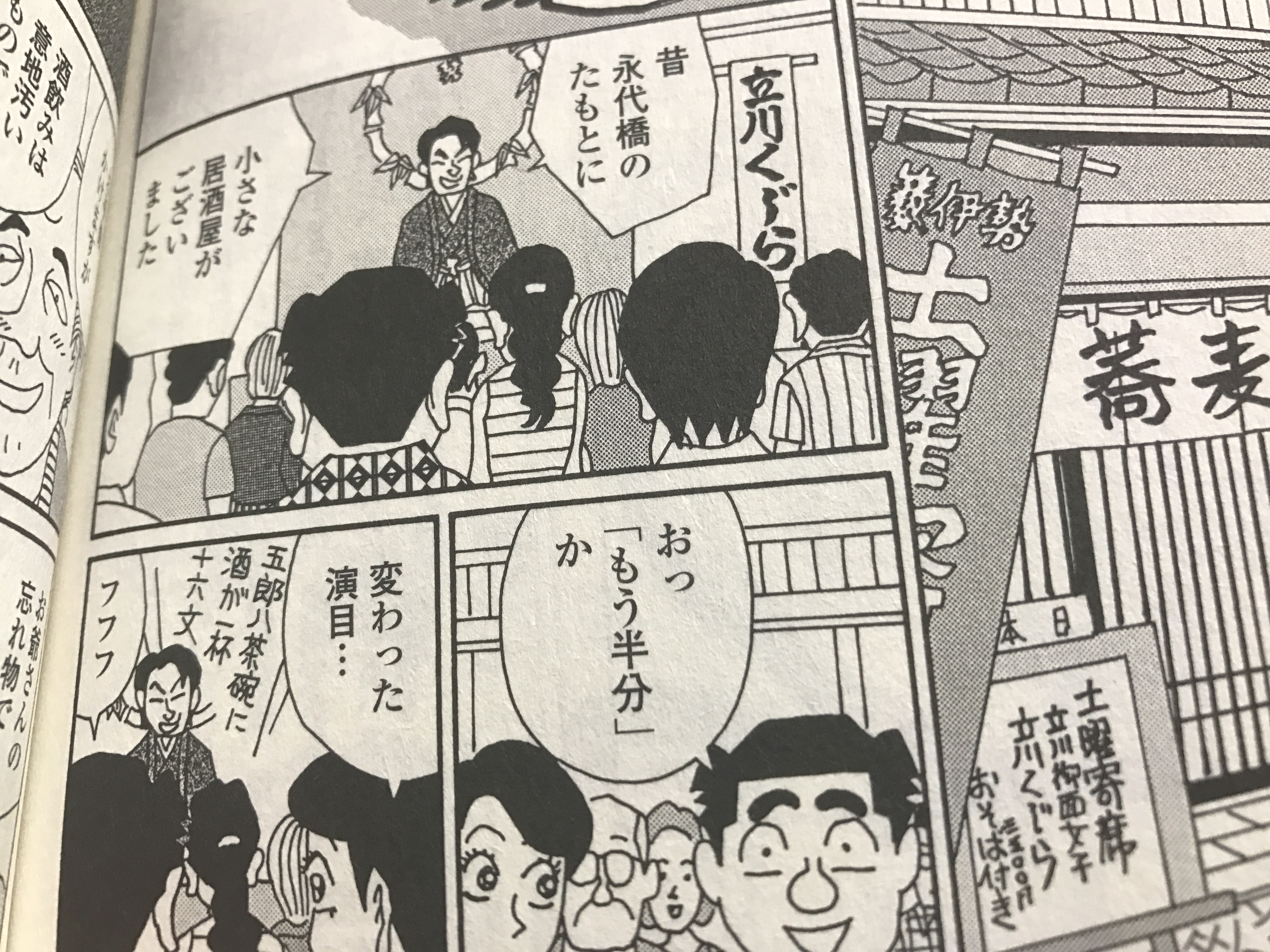 この話は、落語「もう半分」を扱っており、落語とグルメとマンガの融合です。