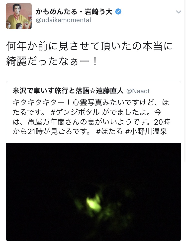 今日、初蛍のツイートをしたら、なんとキングオブコントの覇者「かもめんたる」う大さんからコメントいただきました。