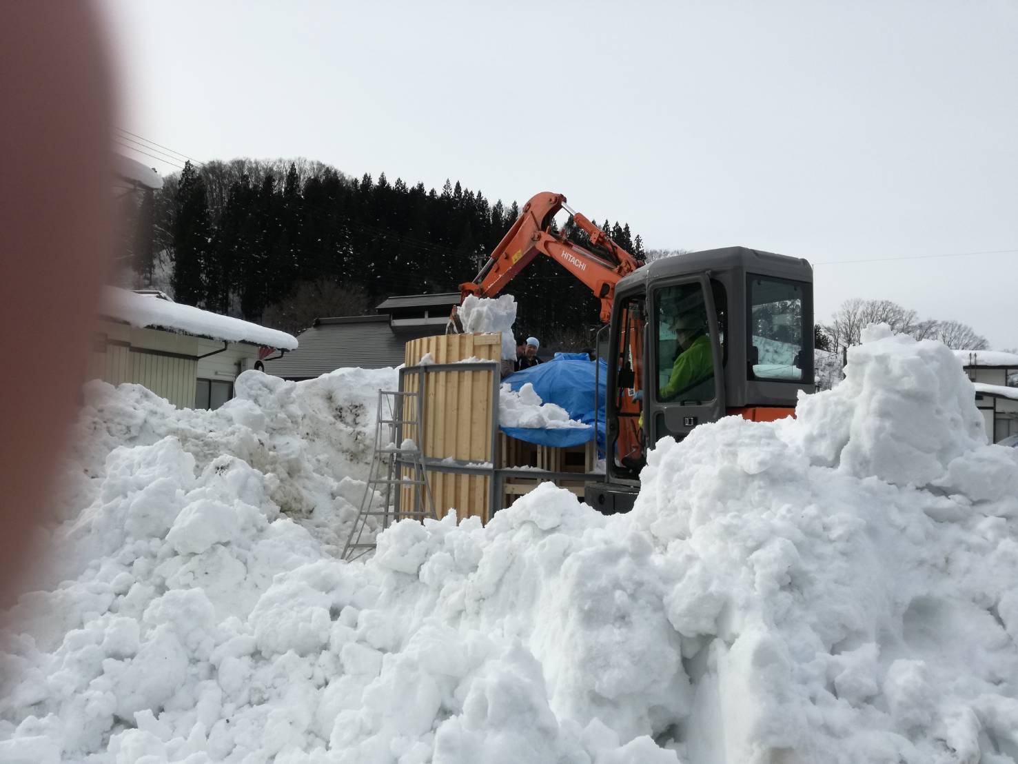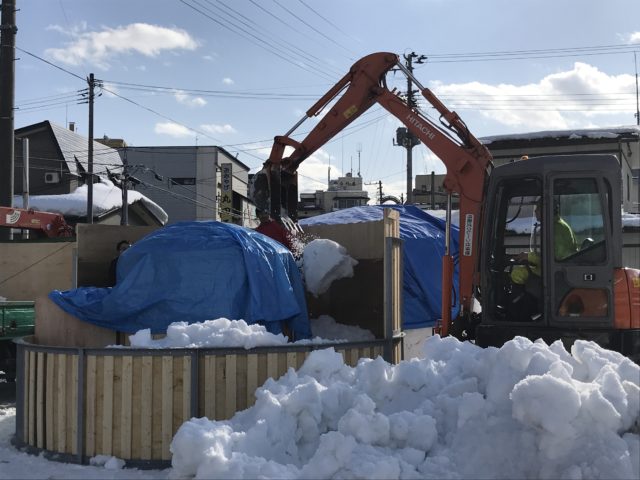 枠の中にショベルカーで雪を入れます
