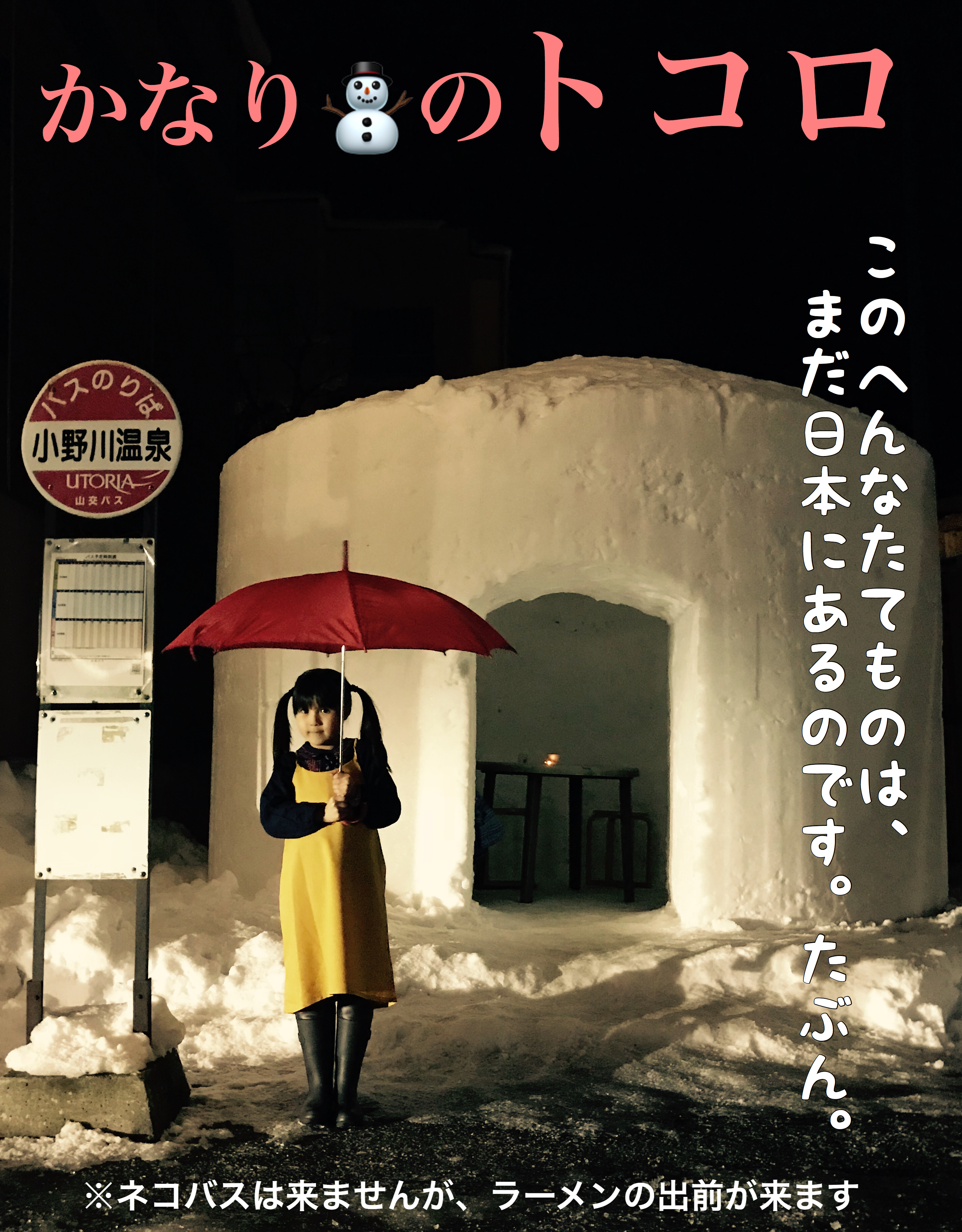 バスを待つなら、かまくらで。お腹すいてるなら、ラーメンも出前できます。 #小野川温泉 #近いよ米沢 #snow #busstop #かまくら https://t.co/ViC6NMvJXa pic.twitter.com/KLHYnsIIzE