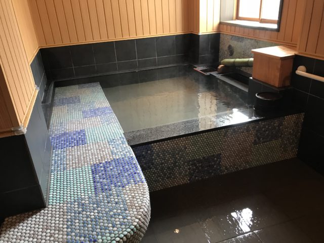 貸切風呂の湯口のお湯を一旦止めて、ちょうどいい高さになるまでお湯を抜く。