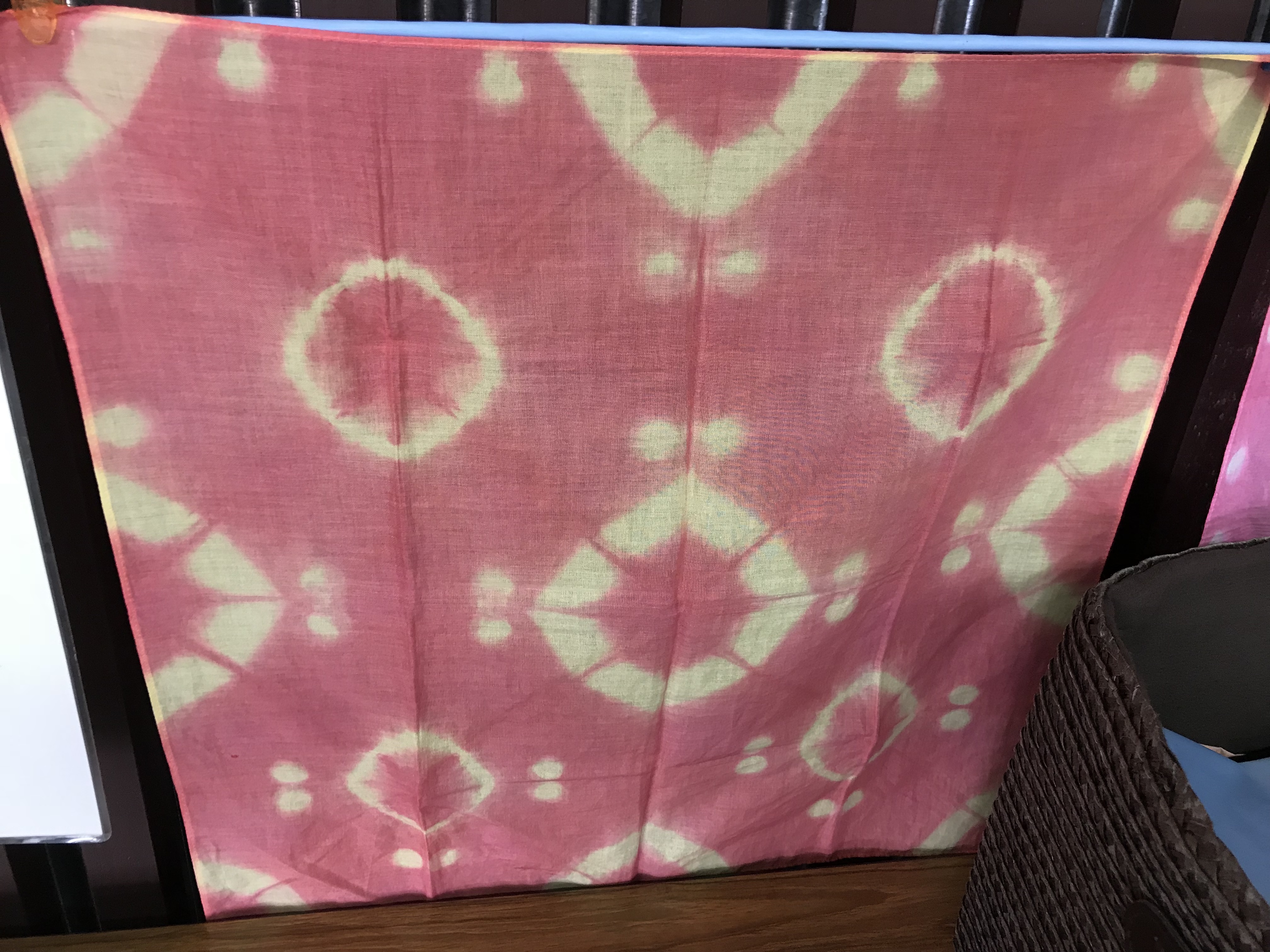 このハンカチ、特徴的な白くなっている部分は、洗濯バサミを挟んだり、紐で縛ったりして、作るのです。