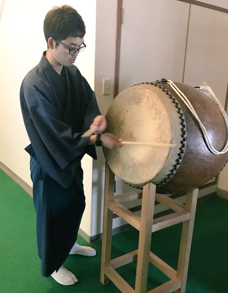 バチが見当たらなかったので、ドラムのスティックで代用してますが、生の太鼓は雰囲気あります。