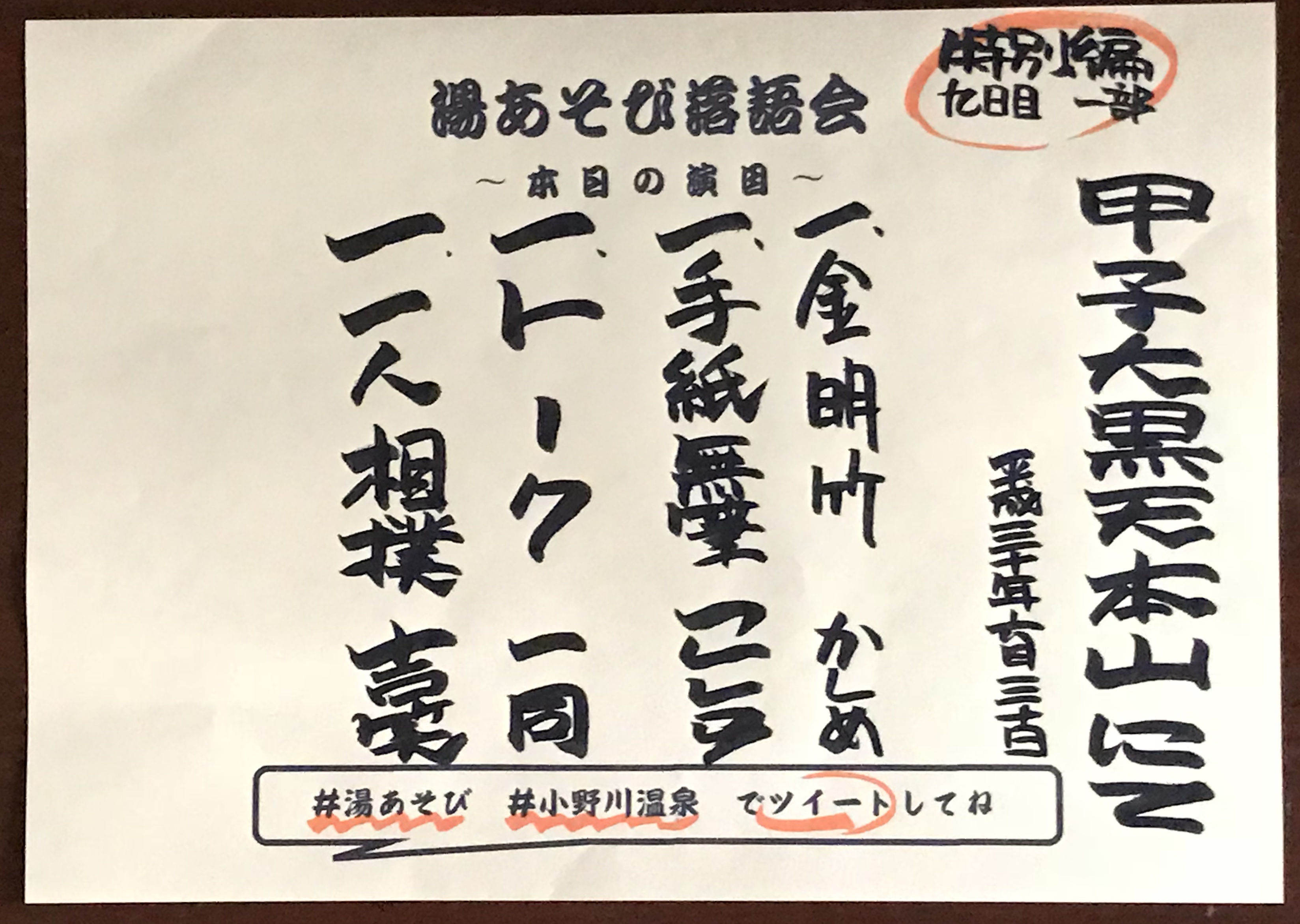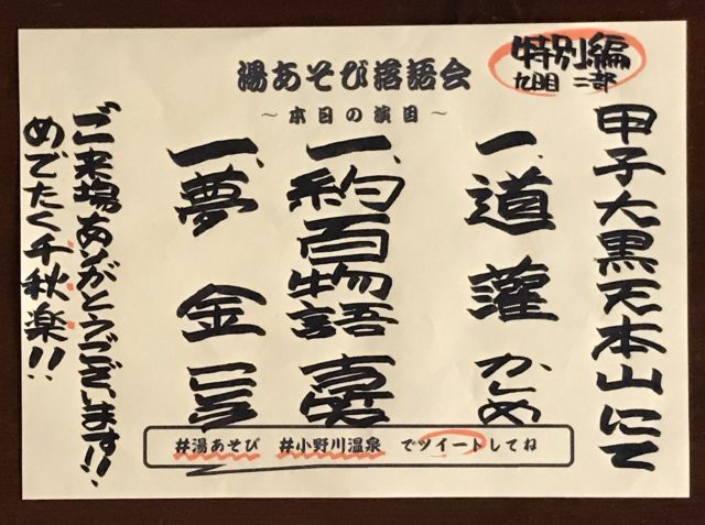 かしめさんは、9回の湯あそび落語会に全出席なさって、すべて違う噺をなさいました。