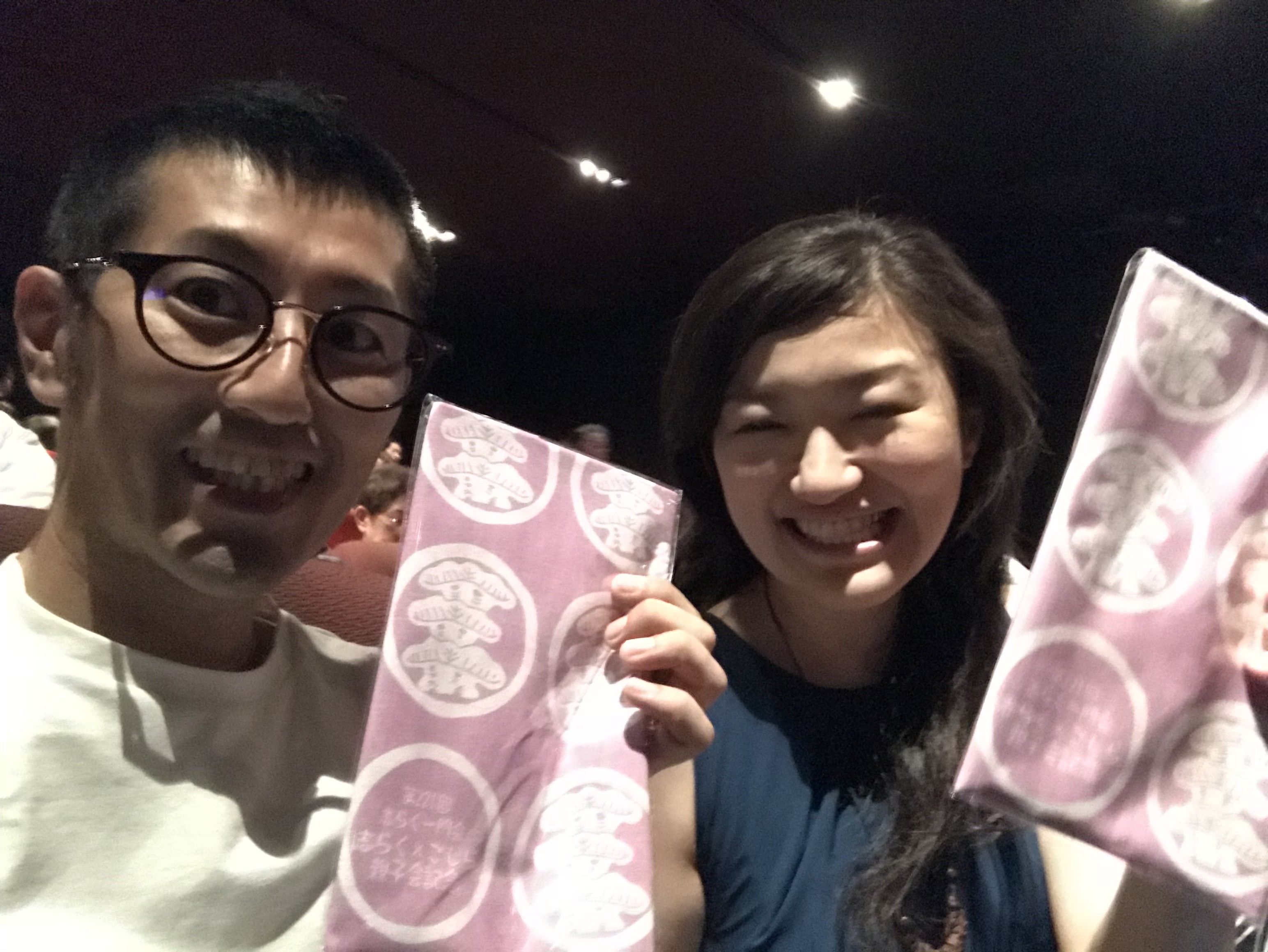 会場で配られた記念手ぬぐいとともに