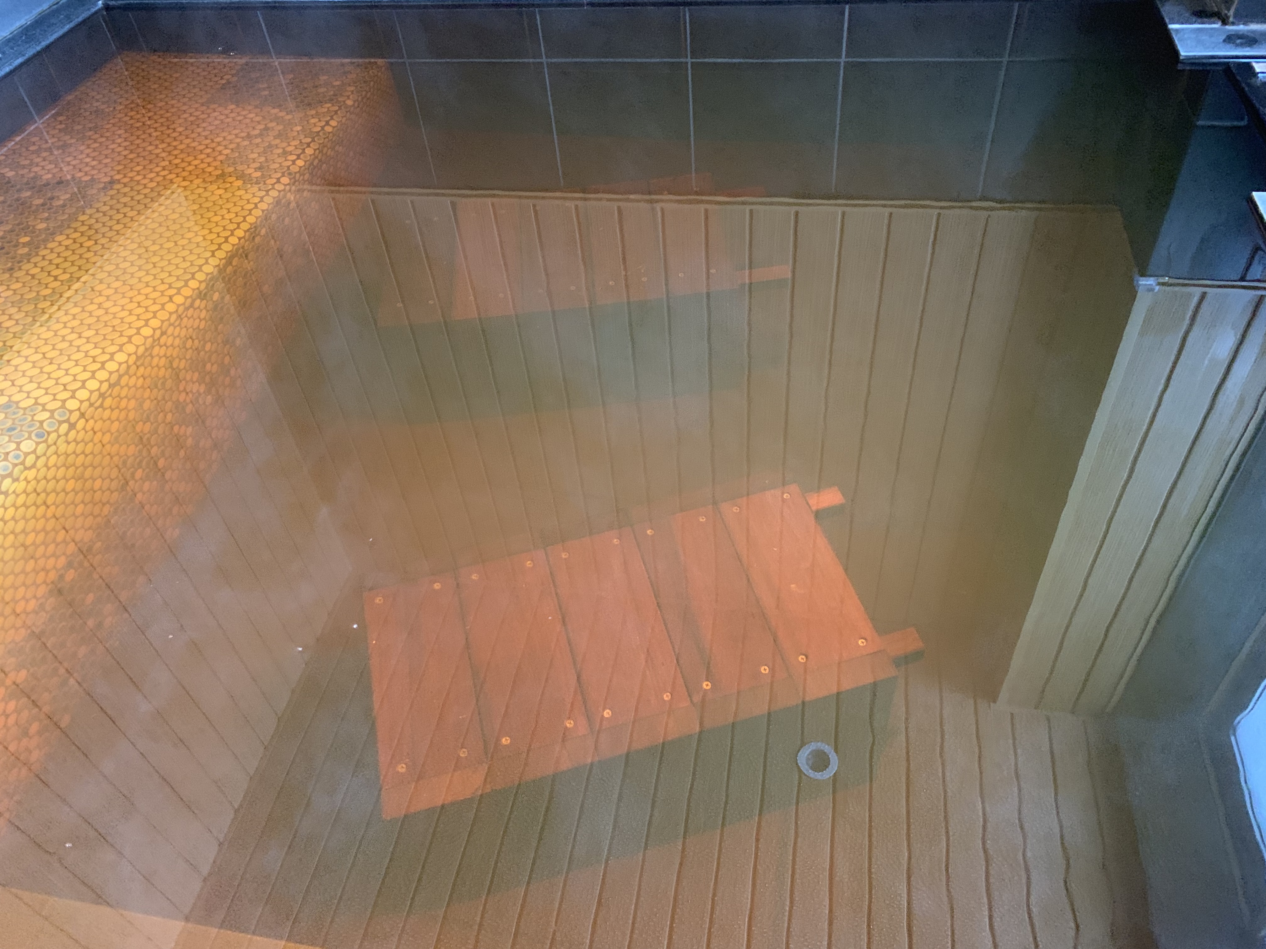 数日、お湯につけて、色が出なくなったので、いよいよ大浴場に設置しました。