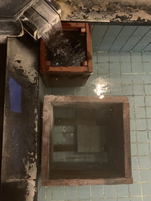 湯口の下に木の箱を置くことで、湯船に入ったお湯を一旦、底まで入るようにします。