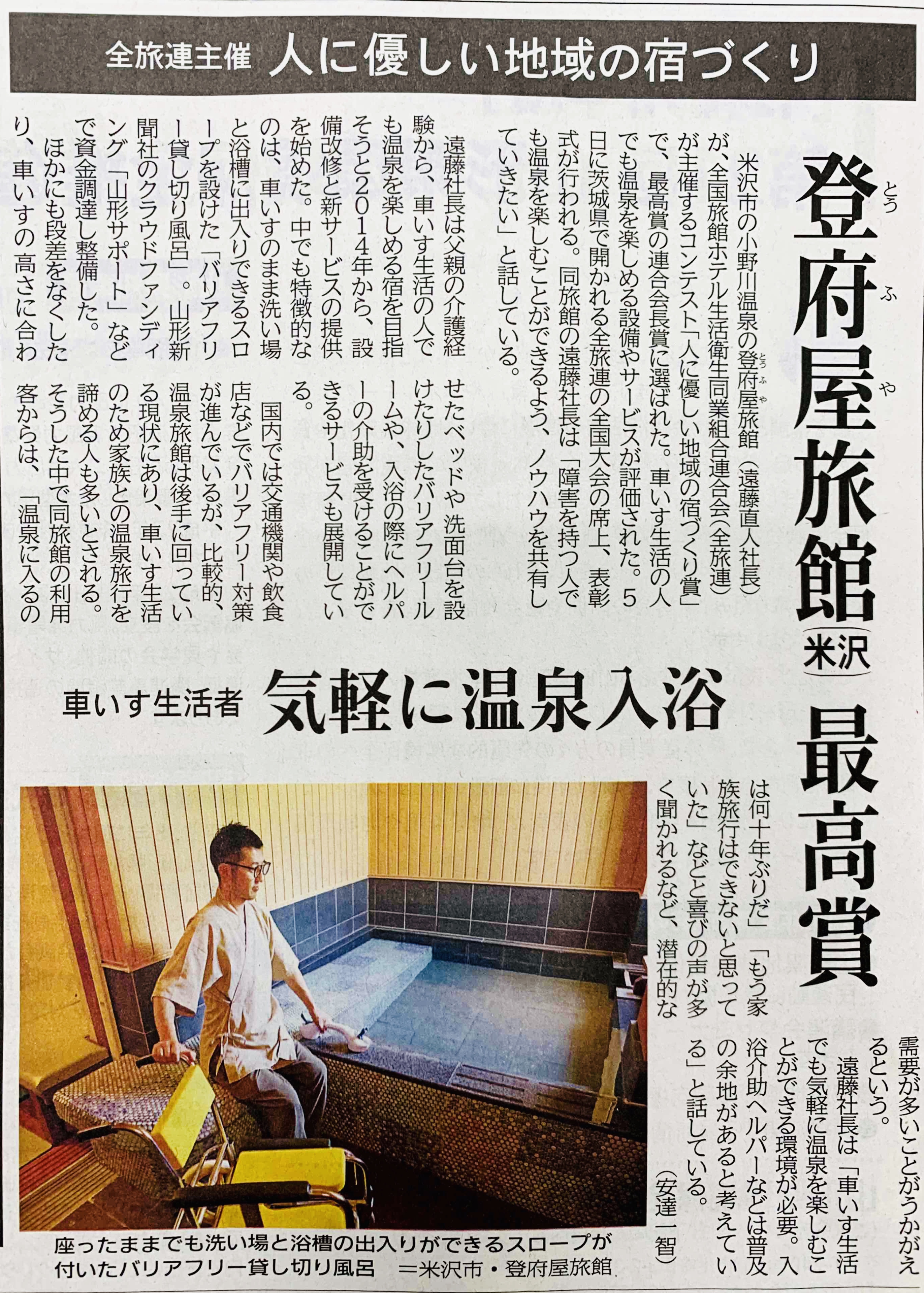 米沢市の小野川温泉の登府屋(とうふや)旅館(遠藤直人社長)が、全国旅館ホテル生活衛生同業組合連合会(全旅連)が主催するコンテスト「人に優しい地域の宿づくり賞」で、最高賞の連合会長賞に選ばれた。車いす生活の人でも温泉を楽しめる設備やサービスが評価された。5日に茨城県で開かれる全旅連の全国大会の席上、表彰式が行われる。同旅館の遠藤社長は「障害を持つ人でも温泉を楽しむことができるよう、ノウハウを共有していきたい」と話している。