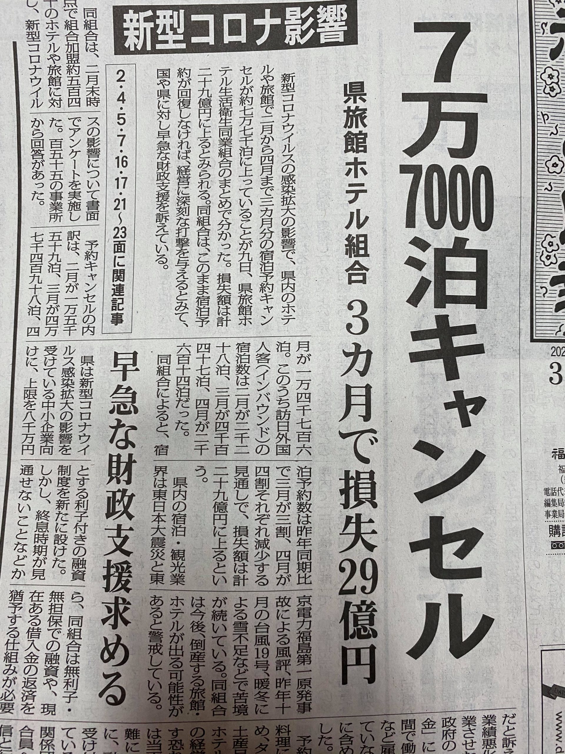福島県の新聞記事。全国の観光地も同様でしょう