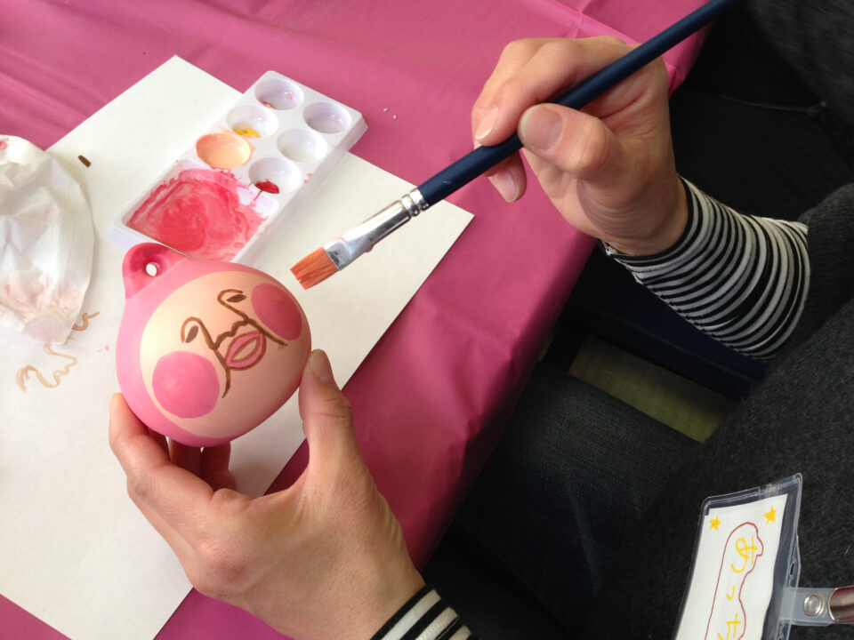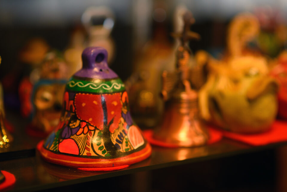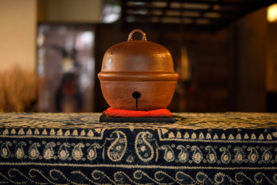 フロント横のショーケースには、お客様が絵付けした個性豊かな鈴が並びます。旅の記念に「鈴の絵付け体験」も承っています。