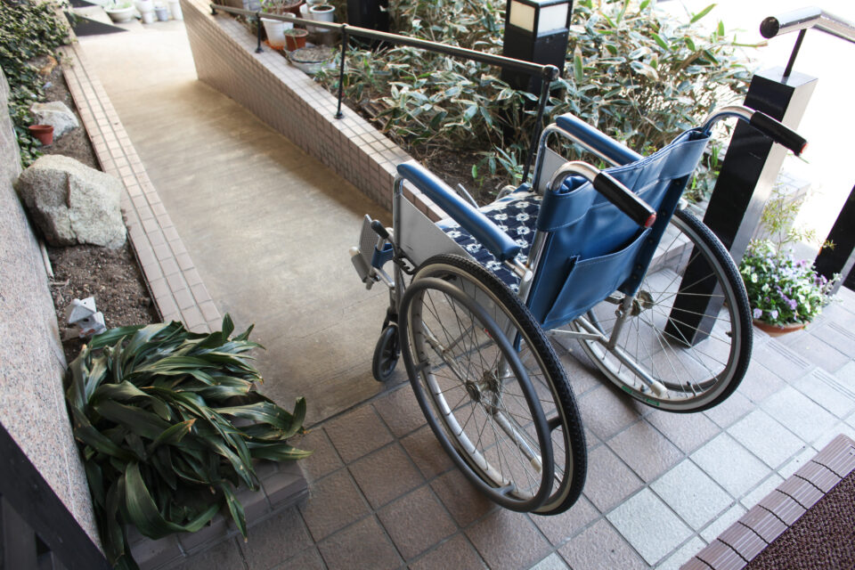 正面に向かって右奥には“車いす専用スペース”を設け、玄関横へつながる“車いす用スロープ”も備えております。雨の日でもスムーズにご到着いただけます。