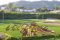 色の違う稲を使って田んぼに絵を描く田んぼアート。宿から歩いて5分のところにある展望台でご覧いただけますよ。スロープの道もあるから、車いすの方でも安心!