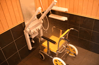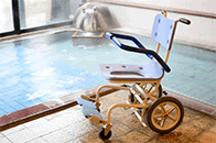 脱衣所から大浴場までは、浴室専用車いすをご用意。浴槽の中まで車いすでは入れませんが、座ったままでシャワーもラクラクです。