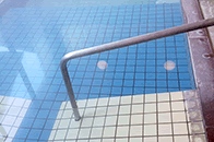 大浴場の浴槽には手すりとスロープがあります。床には滑りにくいタイルを使っていますので、つかまりながら安全に入浴していただけます。
