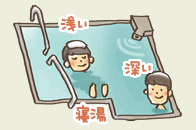 大浴場は2段階の深さになっています。深さによって半身浴・寝湯・肩までと、スタイルを変えて入浴できます。