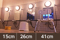 貸切風呂の中に付いています。車いすのまま全身で一気にお湯を浴びることができ、5分間の使用で20分の温浴と同じ効果が得られます。