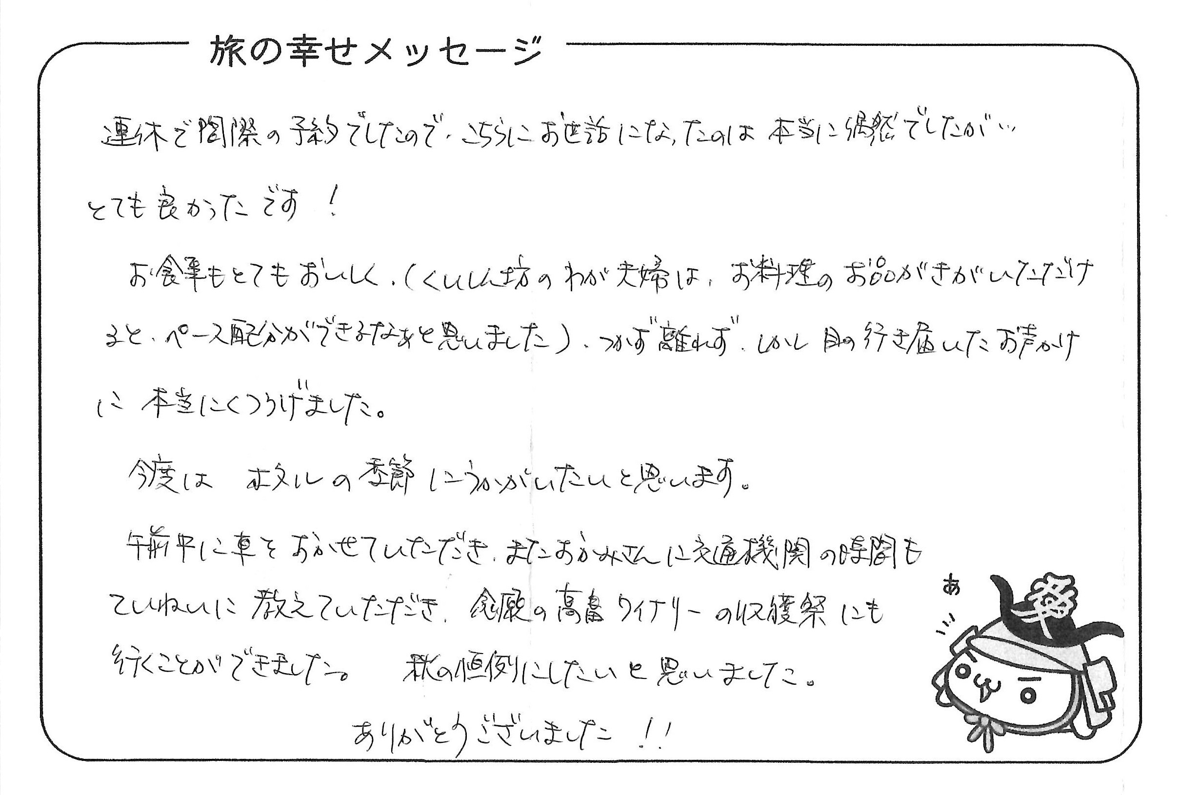お食事もとてもおいしく、(くいしん坊のわが夫婦は、お料理のお品がきがいただけると、ペース配分ができるなあと思いました)つかず離れず、しかし目の行き届いたお声かけに本当にくつろげました。